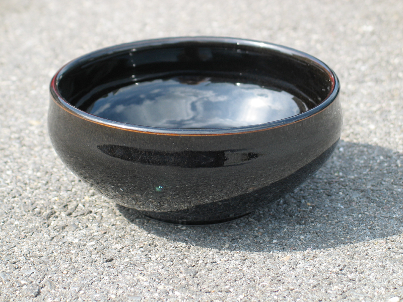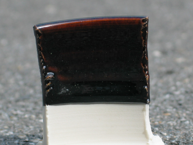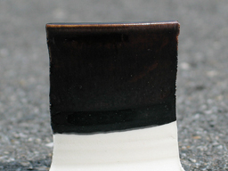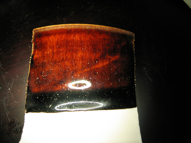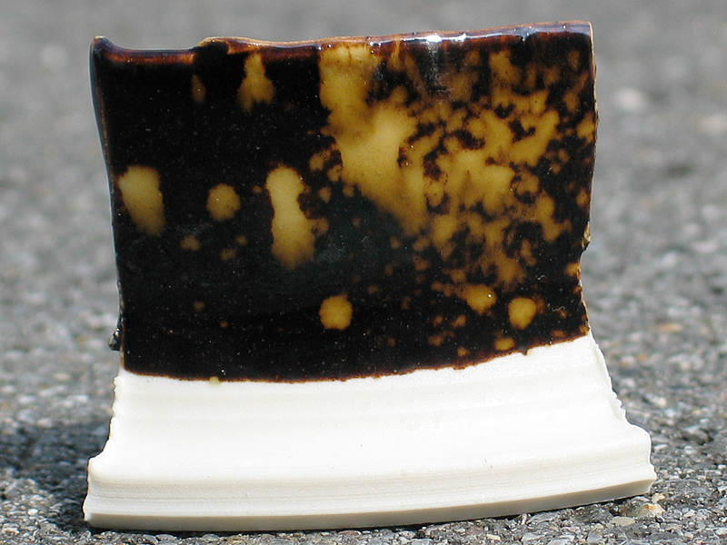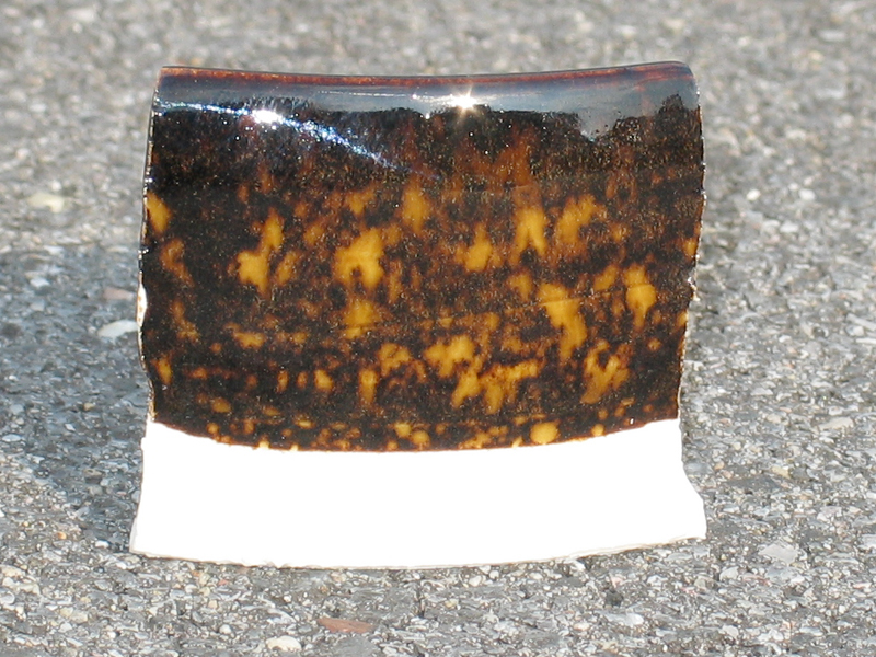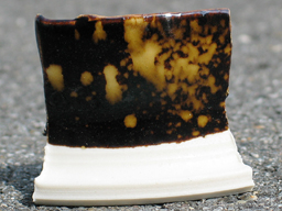 "163 AWQ" is the same wash I used on the Tortoiseshell Tenmoku test tile, shown above. It contains a lot of calcium, as one might expect from analyses of Jizhou Tortoiseshell. The brown stripe is a wash I often use on reduction Tenmoku glazes; it’s about equal parts (by volume) of Ceramic Rutile and Gerstley Borate. The gray wash is something I’m just beginning to test; it contains 8 parts Red Iron Oxide, 1 part Manganese Carbonate, and 1 part Kaolin. I’m not yet sure whether it’s a keeper. (I’ll talk more about "163 AWQ" when I’ve written the article I promised Gerry Williams at the NCECA conference, back in March.) This clay is just melting at cone 9, but is easily turned into a glaze by the addition of a little flux, as you can see from the clear spots.