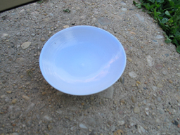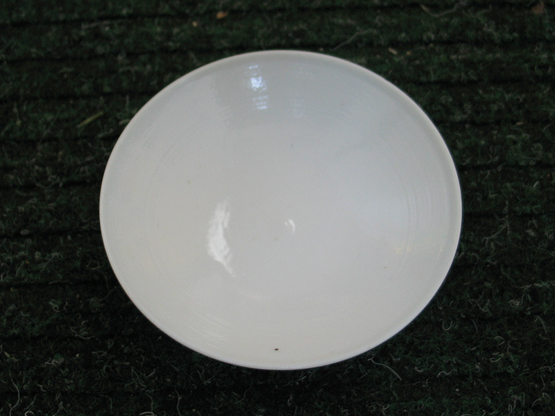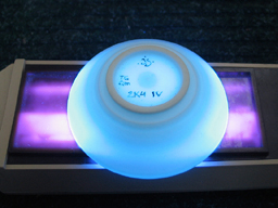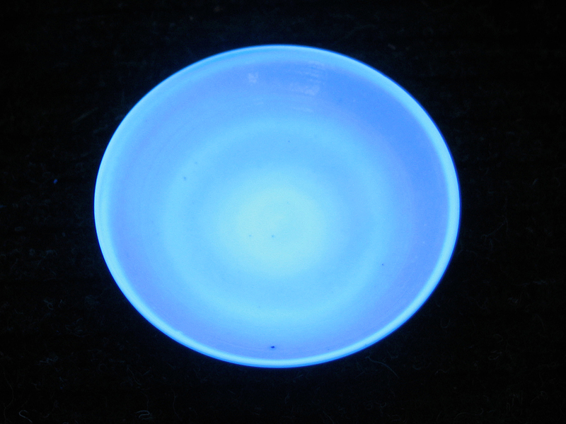 To show you how translucent this stuff is, here’s the saucer with the blacklight behind it -- the glow you see (except at the left and right edges, where the lamp is shining on the outside) is coming through the porcelain...